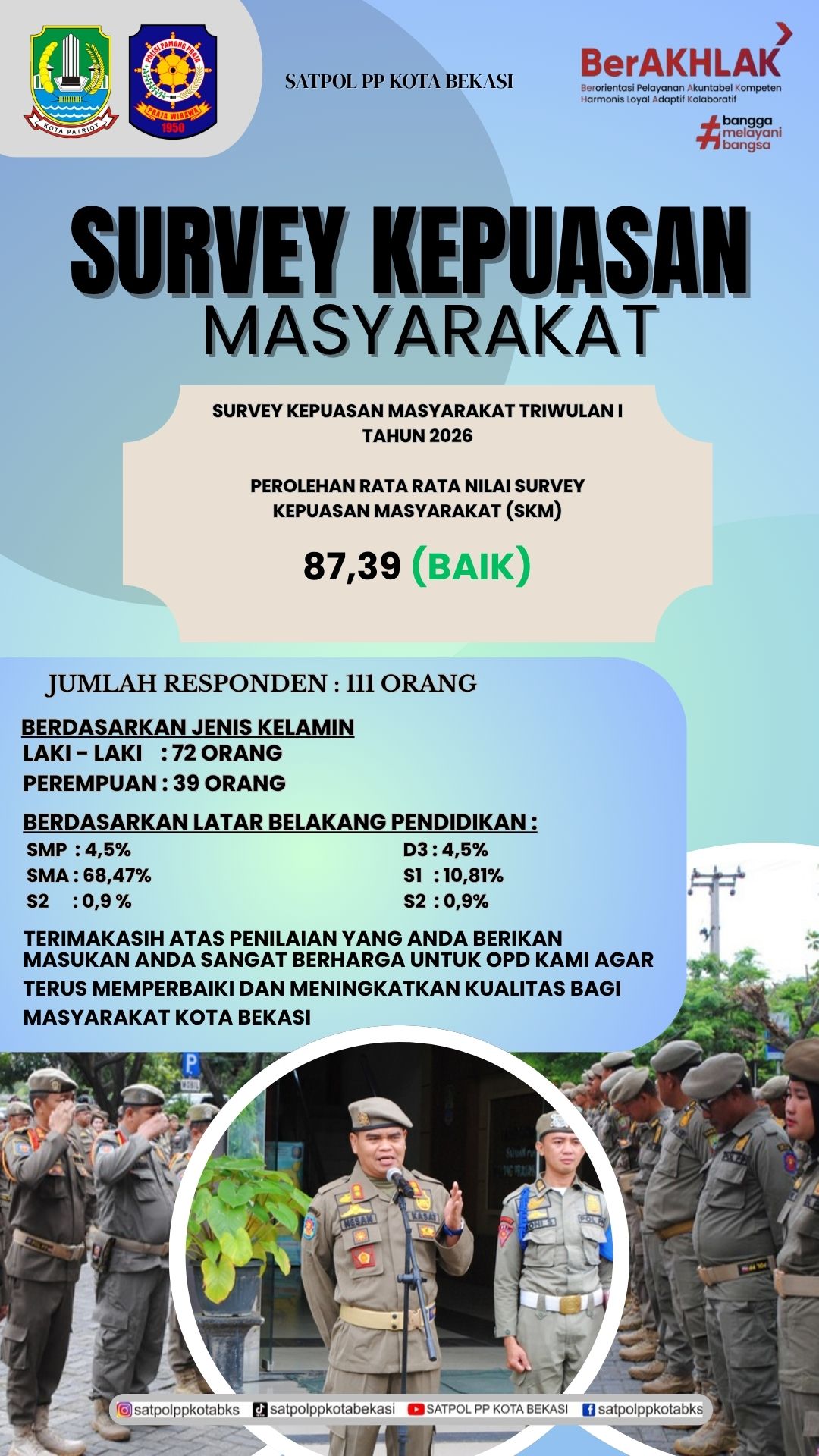 KEPALA SATUAN POLISI PAMONG PRAJA KOTA BEKASI MELAKSANAKAN PEMBINAAN PEGAWAI DALAM APEL GABUNGAN WILAYAH DAN MAKO.